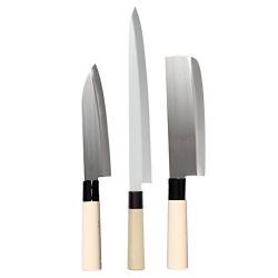 Faca Gyuto牛刀 = Este é o equivalente ocidental da faca de chef. Em japonês, significa literalmente faca de carne. Possui uma ponta e um fio de lâmina mais afiados, bem como uma espessura mais fina. Desta forma, é mais leve e versátil para tarefas que exijam agilidade e destreza.